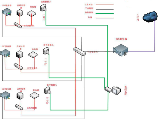 (1)从TMS中控室到各影厅机房至少布2根六类非屏蔽网线。一根走千兆网络,用于给放映服务器传输影片和密钥,一根走百兆网络用于控制影厅设备。